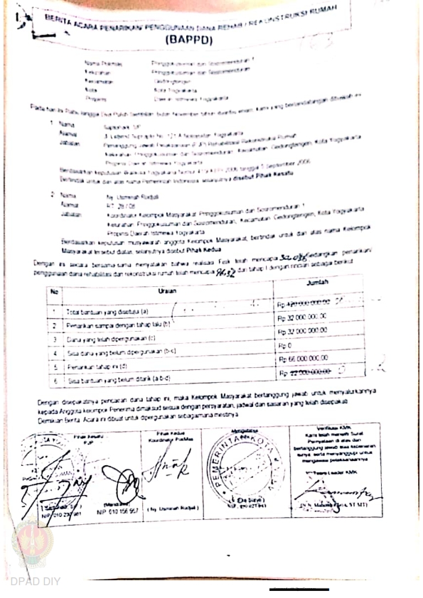 Berita Acara Penarikan / Penggunaan dana Rehab / Rekonstruksi Rumah ( BAPPD ) untuk Rumah Rusak Berat, Nama Kelompok Masyarakat Panembahan 1 & 2, Kel/Desa Panembahan, Kecamatan Kraton, Kabupaten Kota Yogyakarta, Propinsi Daerah Istimewa Yogyakarta. |