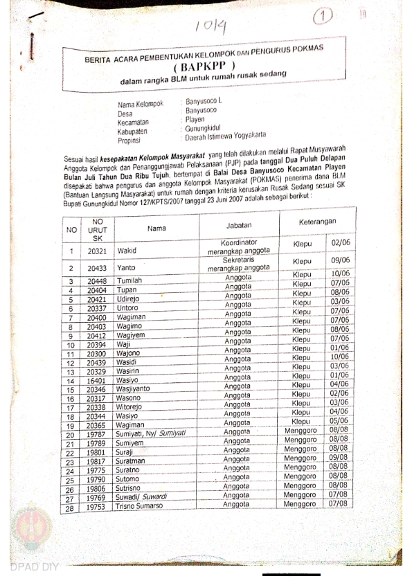 Berita Acara Pembentukan Kelompok dan Pengurus Kelompok Masyarakat dan Penetapan Prioritas Usulan Rehabilitasi dan Rekonstruksi Rumah (BAPKPP) dalam Rangka BLM untuk Rumah Rusak Ringan, Nama Kelompok Masyarakat Pokmas Imogiri, Kel/Desa Imogiri, R-33, R-36, R-39, R-40, R-43, R-44, R-46 s.d R-58 Kecamatan Wukirsari, Kecamatan Imogiri Kabupaten Bantul, Propinsi Daerah Istimewa Yogyakarta.