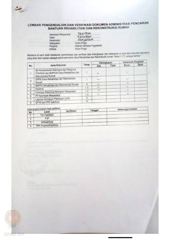 lembar Pengendalian dan Verifikasi Dokumen Administrasi Pencairan Bantuan Rehabilitasi dan Rekonstruksi Rumah, Nama Kelompok Tayuban, Kel/Desa Tayuban, Kecamatan Panjatan, Kabupaten Kulon Progo, Propinsi Daerah Istimewa Yogyakarta.
