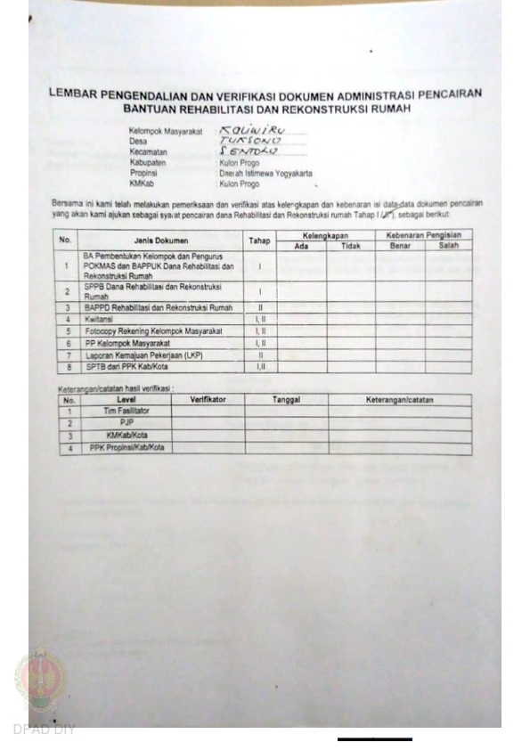 lembar Pengendalian dan Verifikasi Dokumen Administrasi Pencairan Bantuan Rehabilitasi dan Rekonstruksi Rumah, Nama Kelompok Pokmas I Ngestiharjo, Kel/Desa Ngestiharjo, Kecamatan Wates, Kabupaten Kulon Progo, Propinsi Daerah Istimewa Yogyakarta.