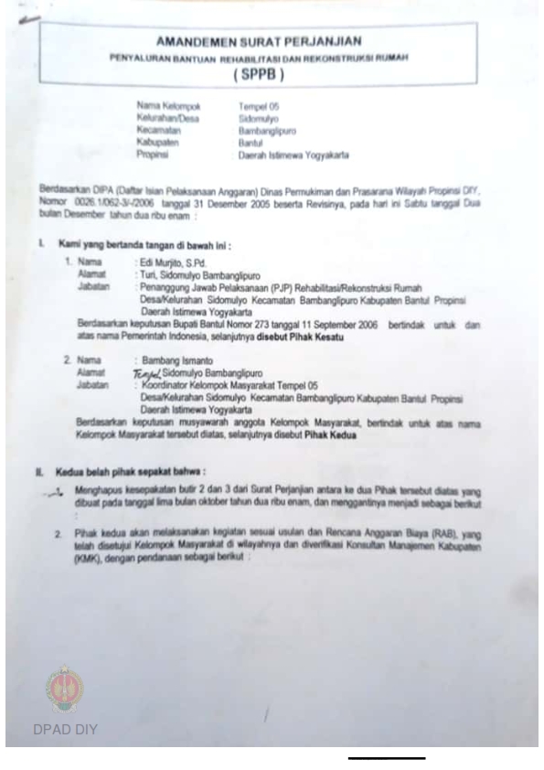 Amandemen Surat Perjanjian Penyaluran Bantuan Rehabilitasi dan Rekonstruksi Rumah (SPPB) Rusak Berat, Nama Kelompok Kraton 16 s.d 18 Desa Mulyodadi, Kecamatan Bambanglipuro, Kabupaten Bantul, Daerah Istimewa Yogyakarta.