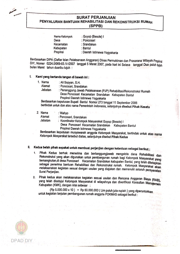 Surat Perjanjian Penyaluran Bantuan Rehabilitasi dan Rekonstruksi Rumah (SPPB), Nama Kelompok Masyarakat Guyup (Besole) 1, Kel/Desa Poncosari, Kecamatan Srandakan, Kabupaten Bantul, Propinsi Daerah Istimewa Yogyakarta. .