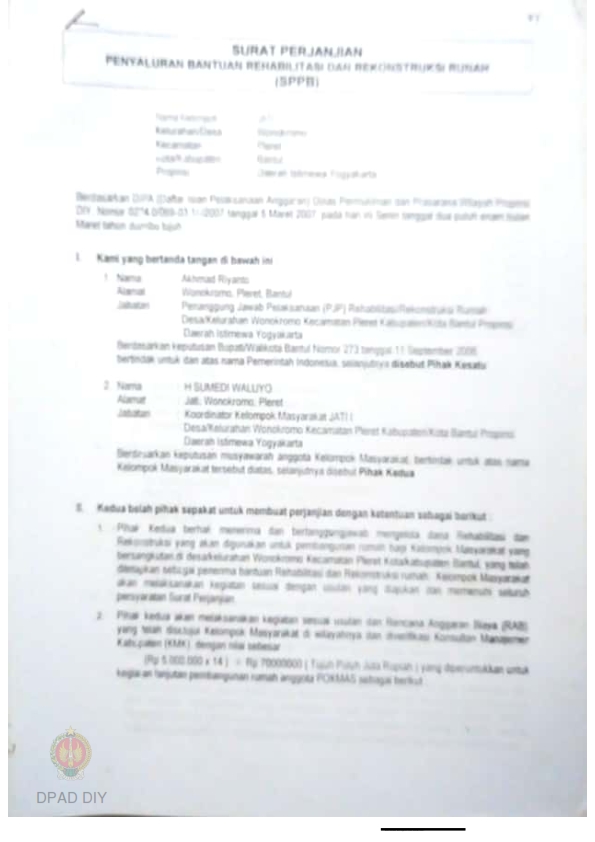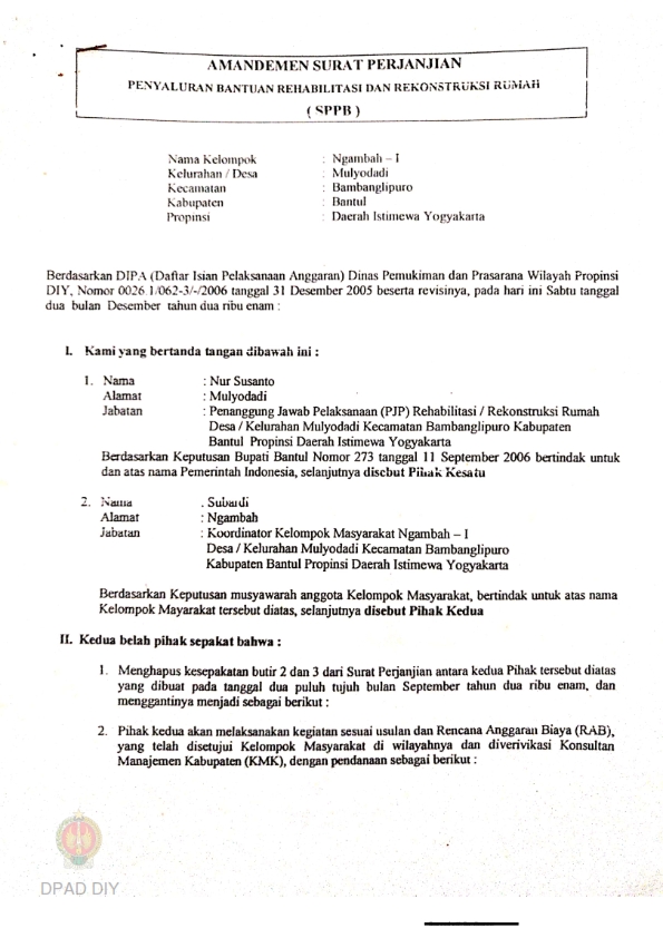 Surat Perjanjian Penyaluran Bantuan Rehabilitasi dan Rekonstruksi Rumah (SPPB), Nama Kelompok Masyarakat Murti Bangun 10 D / Pedak, Kel/Desa Trimurti, Kecamatan Srandakan, Kabupaten Bantul, Propinsi Daerah Istimewa Yogyakarta.