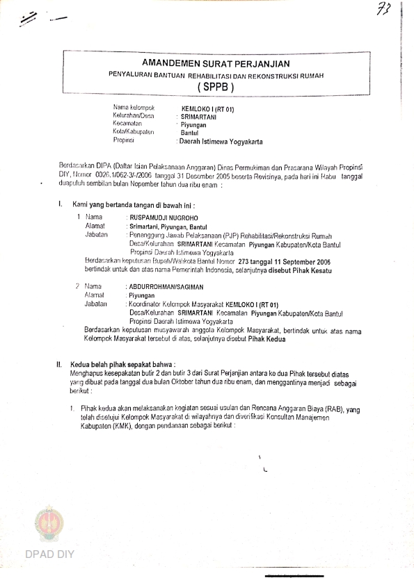 Amandemen Surat Perjanjian Penyaluran Bantuan Rehabilitasi dan Rekonstruksi Rumah (SPPB), Nama Kelompok Masyarakat Kemloko 1 RT 1, Kel/Desa Srimartani, Kecamatan Piyungan, Kabupaten Bantul, Provinsi Daerah Istimewa Yogyakarta.