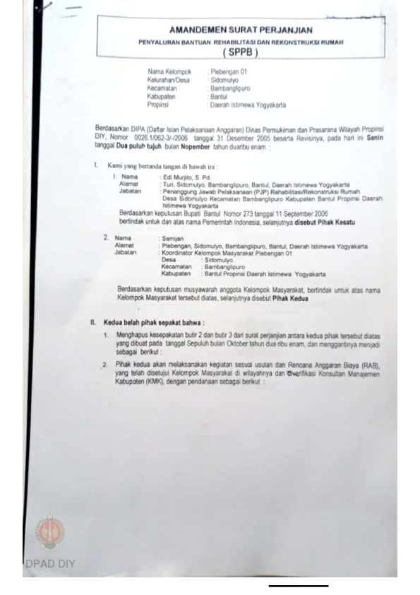 Amandemen Surat Perjanjian Penyaluran Bantuan Rehabilitasi dan Rekonstruksi Rumah (SPPB), Nama Kelompok Jogodayoh 14 s.d 16 Desa Sumbermulyo, Kecamatan Bambanglipuro, Kabupaten Bantul, Daerah Istimewa Yogyakarta.
