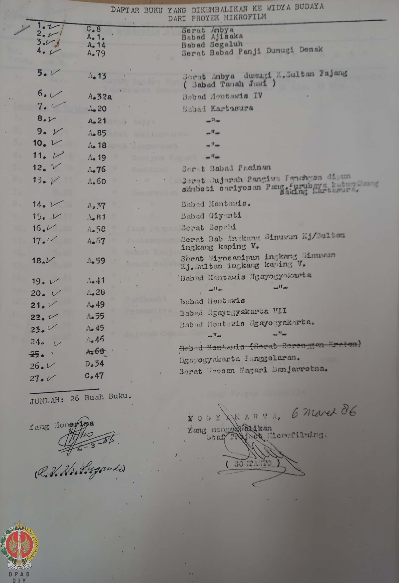 Daftar buku yang dikembalikan ke Widya Budaya dan Proyek Mikrofilm beserta lampirannya