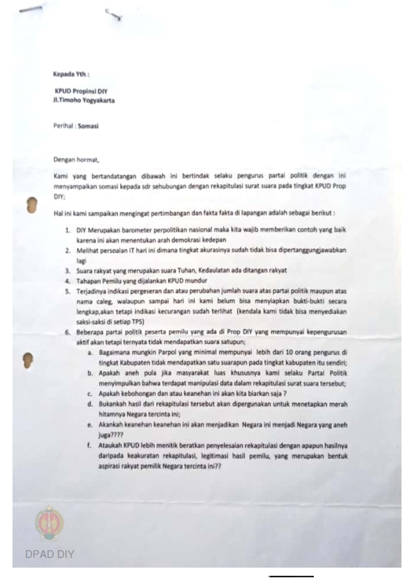 Surat dari Perwakilan Partai Politik dan Masyarakat Umum kepada KPUD Provinsi DIY perihal perhitungan ulang rekapitulasi surat suara dengan berdasarkan pada formulir C-2.