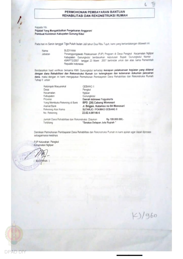Permohonan Pembayaran Bantuan Rehabilitasi dan Rekonstruksi Rumah, Kelompok Masyarakat Gebang II, Kelurahan Pengkol, Kecamatan Nglipar, Kabupaten Gunungkidul, Provinsi Daerah Istimewa Yogyakarta. |