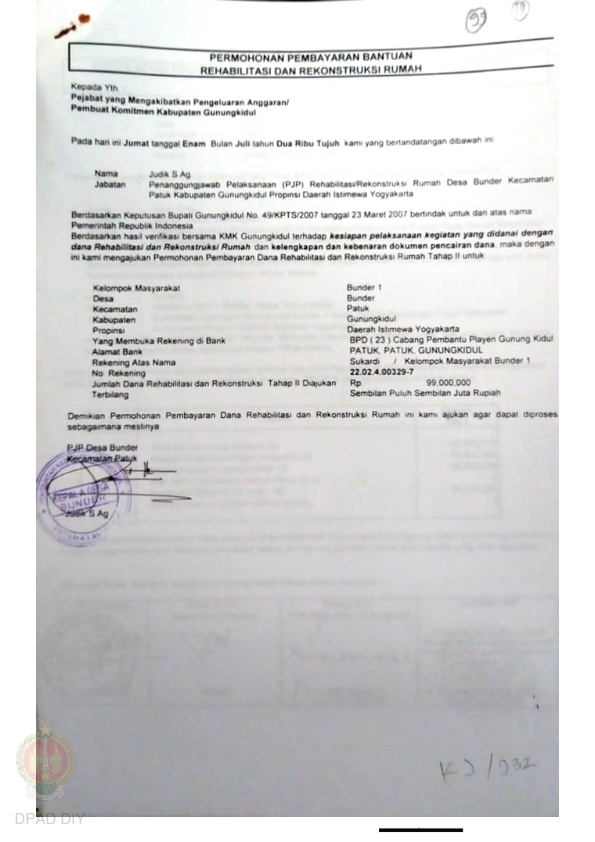 Permohonan Pembayaran Bantuan Rehabilitasi dan Rekonstruksi Rumah, Kelompok Masyarakat Bunder 12 s.d 15, Kelurahan Bunder, Kecamatan Patuk, Kabupaten Gunungkidul, Provinsi Daerah Istimewa Yogyakarta. |