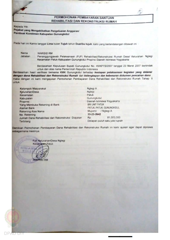 Permohonan Pembayaran Bantuan Rehabilitasi dan Rekonstruksi Rumah, Kelompok Masyarakat Dengok, Getas, Kelurahan Dengok, Getas, Kecamatan Playen, Kabupaten Gunungkidul, Provinsi Daerah Istimewa Yogyakarta. |