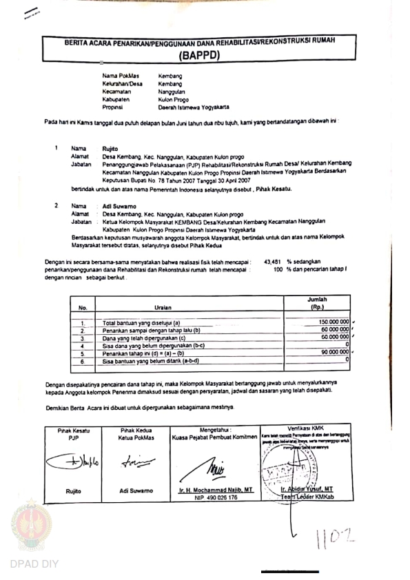 Berita Acara Penarikan/Penggunaan Dana Rehabilitasi/Rekonstruksi Rumah (BAPPD) Rusak Berat, Nama Kelompok Kembang, Kelurahan Kembang, Kecamatan Nanggulan, Kabupaten Kulon Progo, Propinsi Daerah Istimewa Yogyakarta.