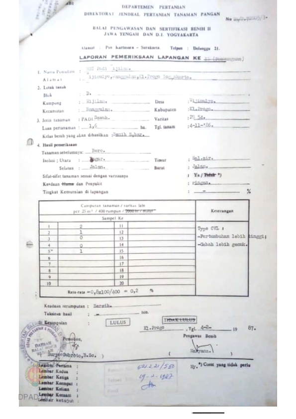 Laporan hasil pemeriksaan lapangan ke II BPSB II Jateng dan DIY jenis tanaman padi sawah Varitas PB 54 dan PB 36 di desa Wijimulyo Nanggulan Kulonprogo bulan Pebruari 1987