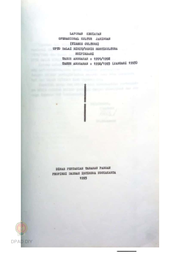 Laporan Kegiatan Operasional Kultur Jaringan (Tissue Culture) UPTD Balai Bibit/Benih Holtikultura Ngipiksari TA. 1991/1992 dan 1992/1993