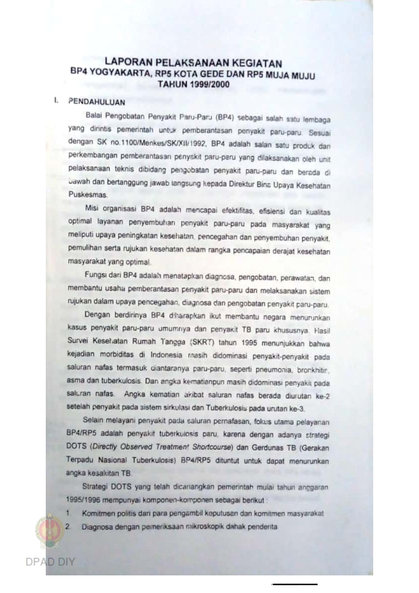 Laporan tahunan pelaksanaan kegiatan unit pelaksana teknis tahun 1999/2000 Balai Pengobatan Penyakit Yogyakarta, Rumah Perawatan Penderita Penyakit Paru-Paru kotagede dan Muja-Muju