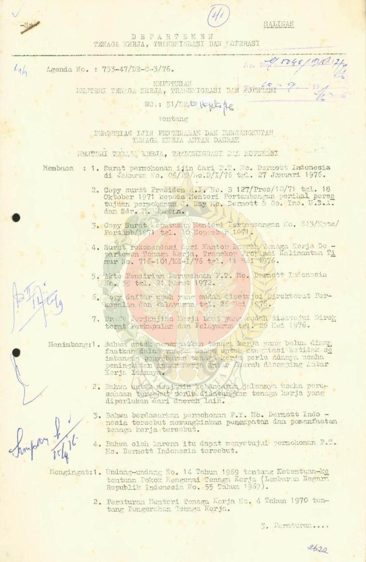 SK Menteri Tenaga Kerja, Transmigrasi dan Koperasi N0 51/OB/C/Kpts tentang pemberian ijin tentang pengerahan dan pengangkutan tenaga kerja antar daerah.